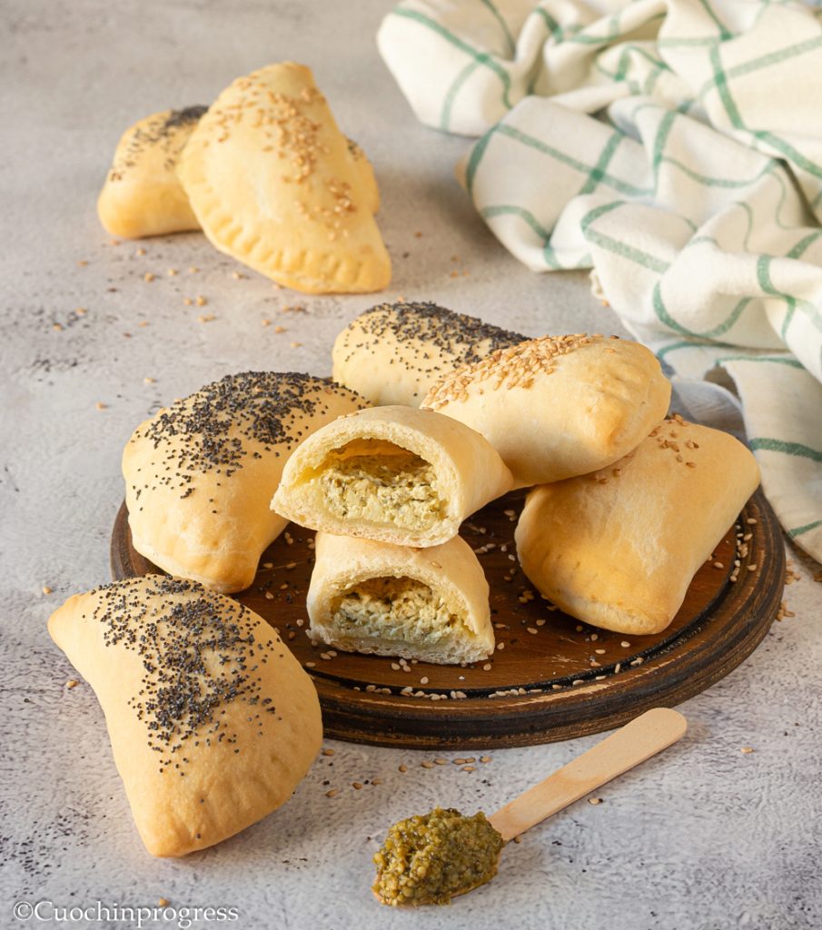 À la fin de la seconde pousse, badigeonnez les mezzalunes d’huile et décorez-les avec des graines de sésame et de pavot.