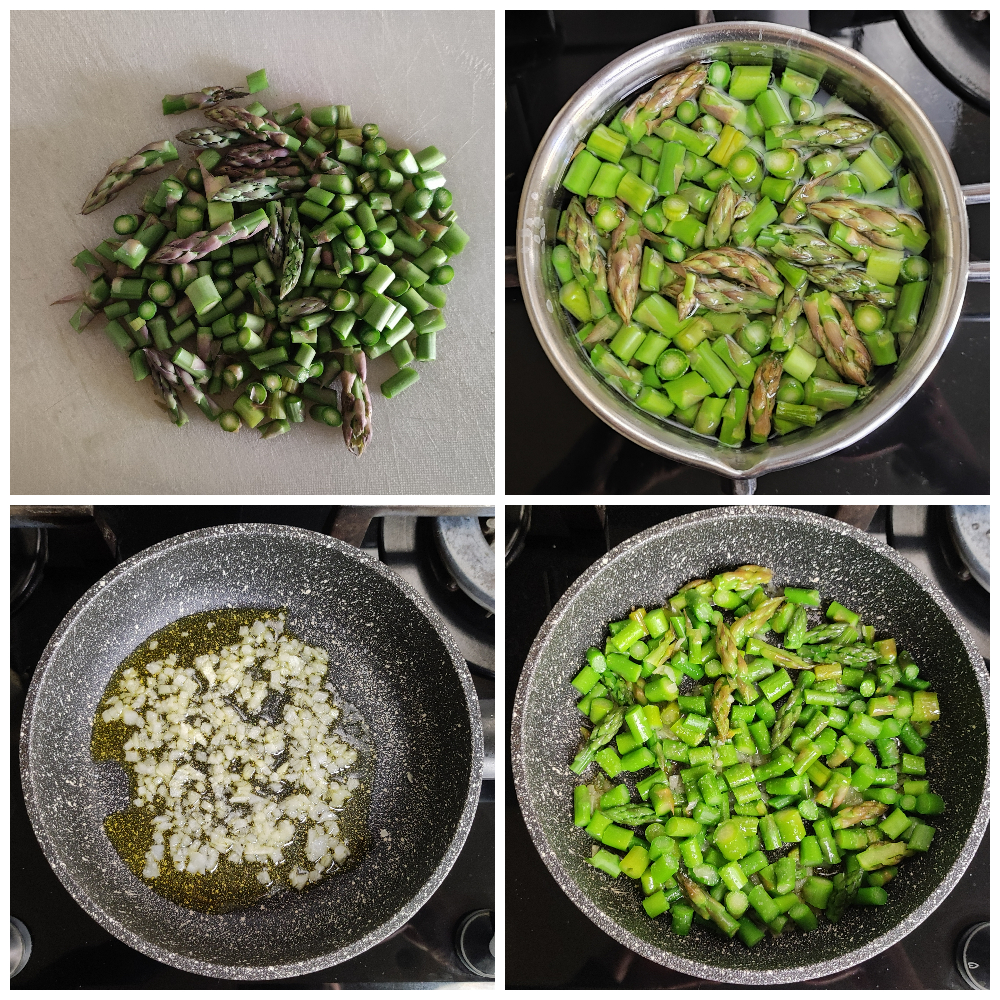 Pour commencer, faites revenir l’oignon finement haché dans la poêle avec l’huile pendant 3–4 minutes, puis ajoutez les asperges préalablement nettoyées, coupées en rondelles et blanchies 5 minutes dans de l’eau salée, et laissez-les s’imprégner des saveurs pendant quelques minutes.