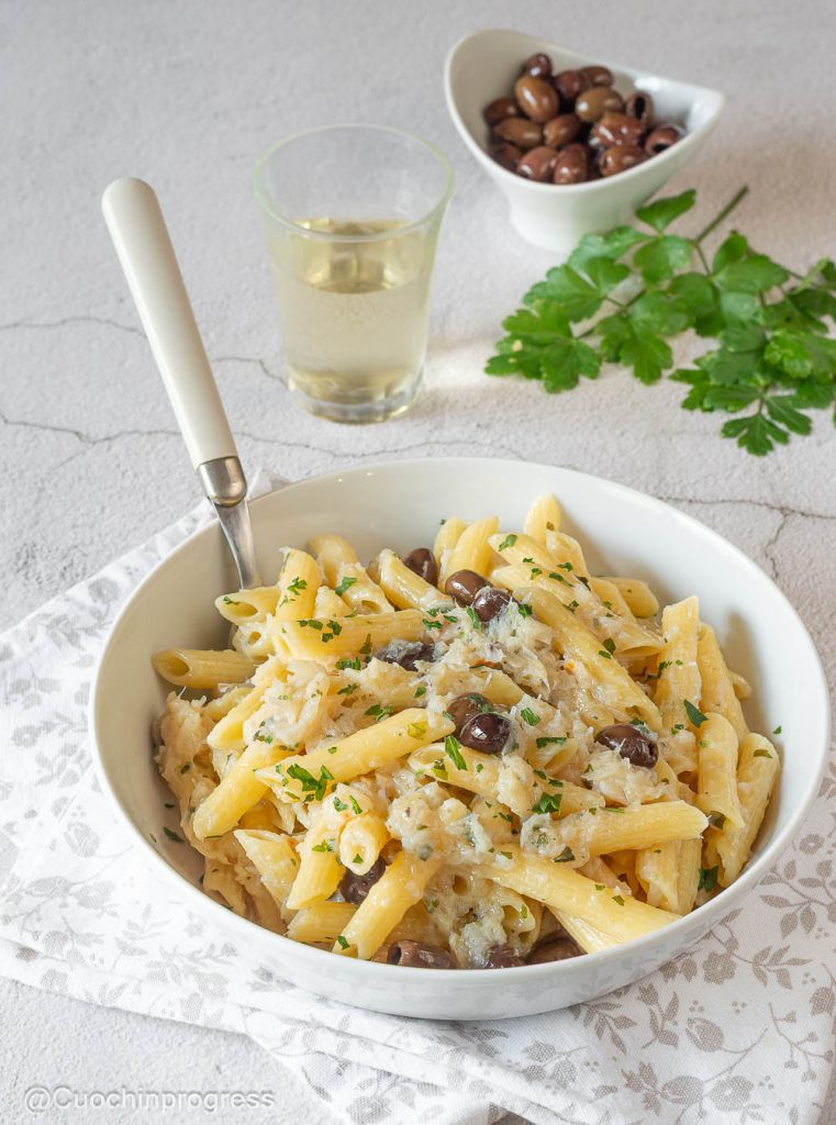 Les PÂTES À LA MORUE ET AUX OLIVES sont un premier plat gourmand et très savoureux, riche et assez particulier, parfait à proposer en de nombreuses occasions, y compris les jours de fête, lorsque l’on veut faire plaisir à ses convives. C’est un plat complet qui, en quantité adaptée, peut aussi devenir le plat principal du repas, si vos invités raffolent de morue comme moi.