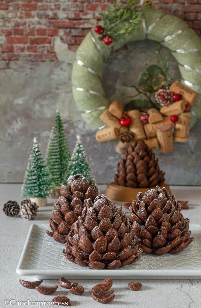 Les PIGNES AU CHOCOLAT sont de délicieux petits gâteaux, parfaits pour Noël, le Nouvel An et toute la période des Fêtes, qui marient la beauté de leur forme originale à la gourmandise de leur garniture, moelleuse et riche en chocolat. La pomme de pin, en effet, depuis l’Antiquité est un symbole de santé, prospérité et bonne fortune et elle est souvent posée sur les tables lors des moments joyeux. Ici, toutefois, le bonheur est double : il vient à la fois du vœu qu’elle rappelle et du goût gourmand de ce petit gâteau.