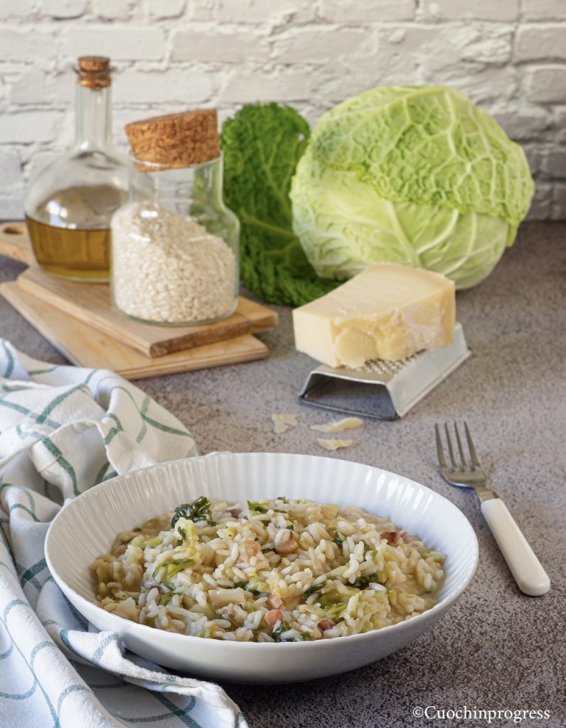 Le RISOTTO AU CHOU VERT ET À LA PANCETTA est un premier plat de la tradition paysanne, rustique et très savoureux, qui peut être le plat principal d’un déjeuner pendant la saison automnale ou l’hiver, quand le chou (verza) devient la dernière légume la plus présente au potager. C’est un plat simple à préparer, comme vous pourrez le voir, mais plutôt intéressant au palais, qui en général satisfait tous nos convives, même les plus raffinés.
