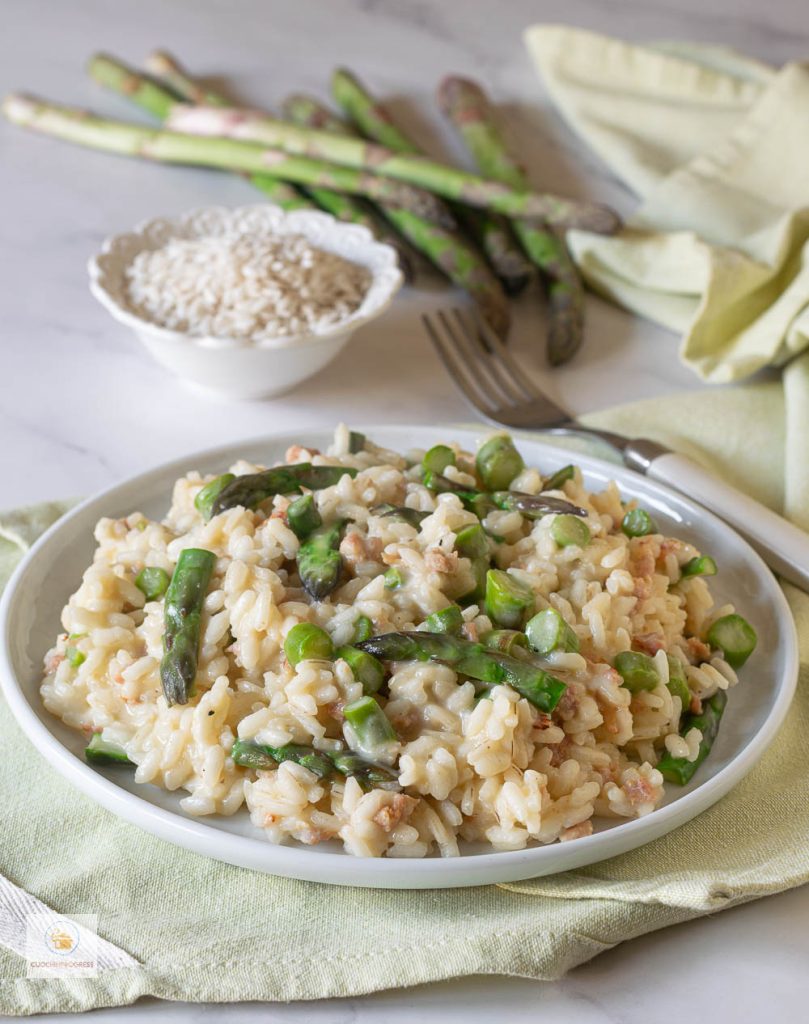 Le RISOTTO AUX ASPERGES, SAUCISSE ET ROBIOLA est un premier plat crémeux et enveloppant, idéal au printemps, quand les asperges sont à leur apogée. Un assemblage de saveurs bien équilibré, où la fraîcheur végétale des asperges se marie harmonieusement au goût affirmé de la saucisse et à la douceur crémeuse de la robiola.