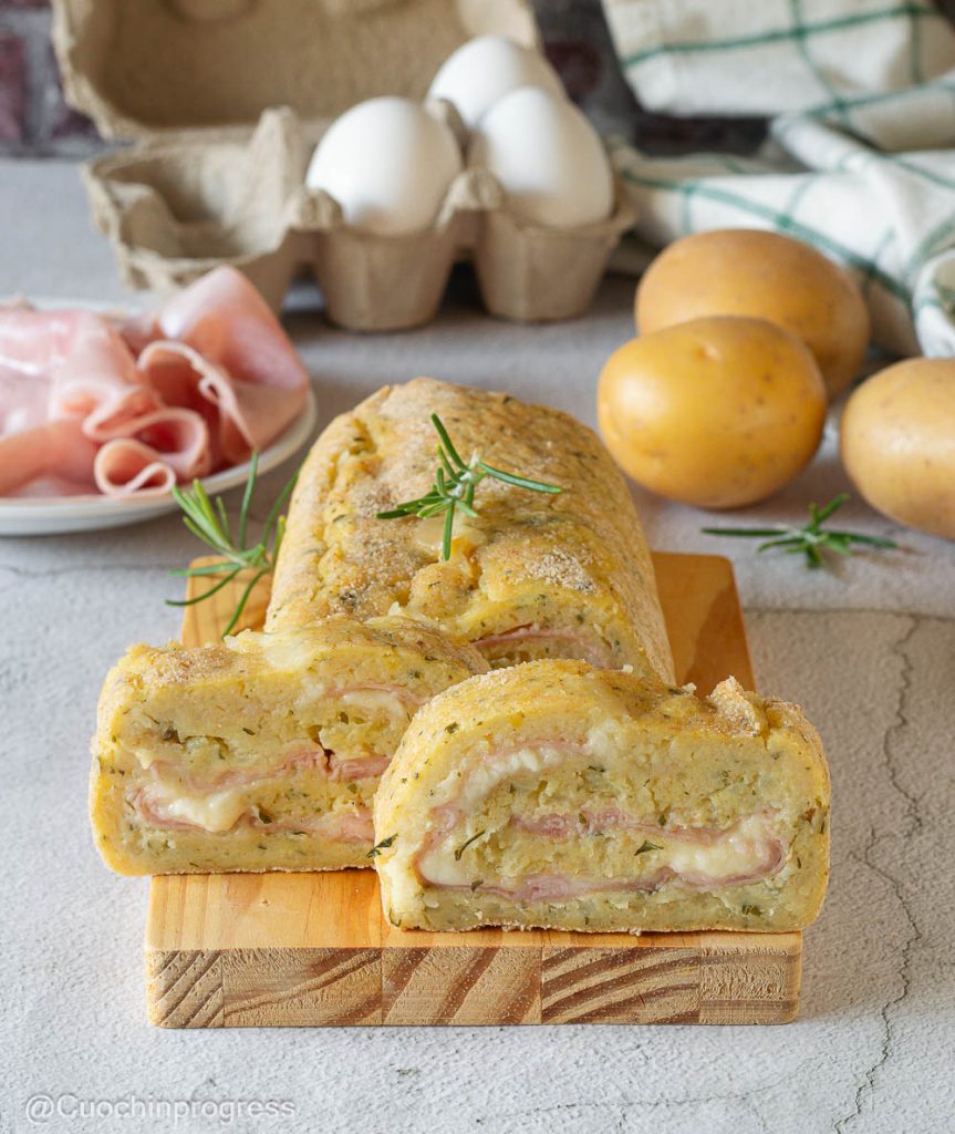 Le ROULEAU DE POMMES DE TERRE FARCI est un plat principal ou plat unique simple mais spectaculaire, idéal pour un dîner en famille ou un repas spécial. La base, préparée avec des pommes de terre bouillies écrasées, des œufs et du fromage râpé, devient une pâte moelleuse et compacte qui renferme un cœur filant de fromage et la saveur gourmande du jambon cuit.