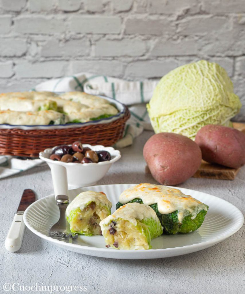 Les ROULÉS DE CHOU VERT AUX POMMES DE TERRE, OLIVES ET CÂPRES sont un plat simple, goûteux et parfumé, idéal en hiver. Les feuilles de chou, blanchies pour devenir souples et maniables, enveloppent une farce crémeuse à base de pommes de terre bouillies écrasées, agrémentées d’olives noires émincées et de câpres, qui apportent une saveur salée et prononcée.