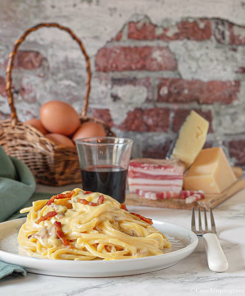 Il est vrai que la carbonara n’est pas citée dans le manuel classique de cuisine romaine d’Ada Boni, publié en 1930. En fait, le plat est mentionné pour la première fois juste après la libération de Rome en 1944, lorsque du bacon apporté par les troupes anglo-américaines apparut sur les marchés romains. Cela pourrait expliquer pourquoi, dans la carbonara, contrairement à d’autres sauces comme l’amatriciana, la pancetta et le guanciale sont souvent présentés comme des ingrédients équivalents.
