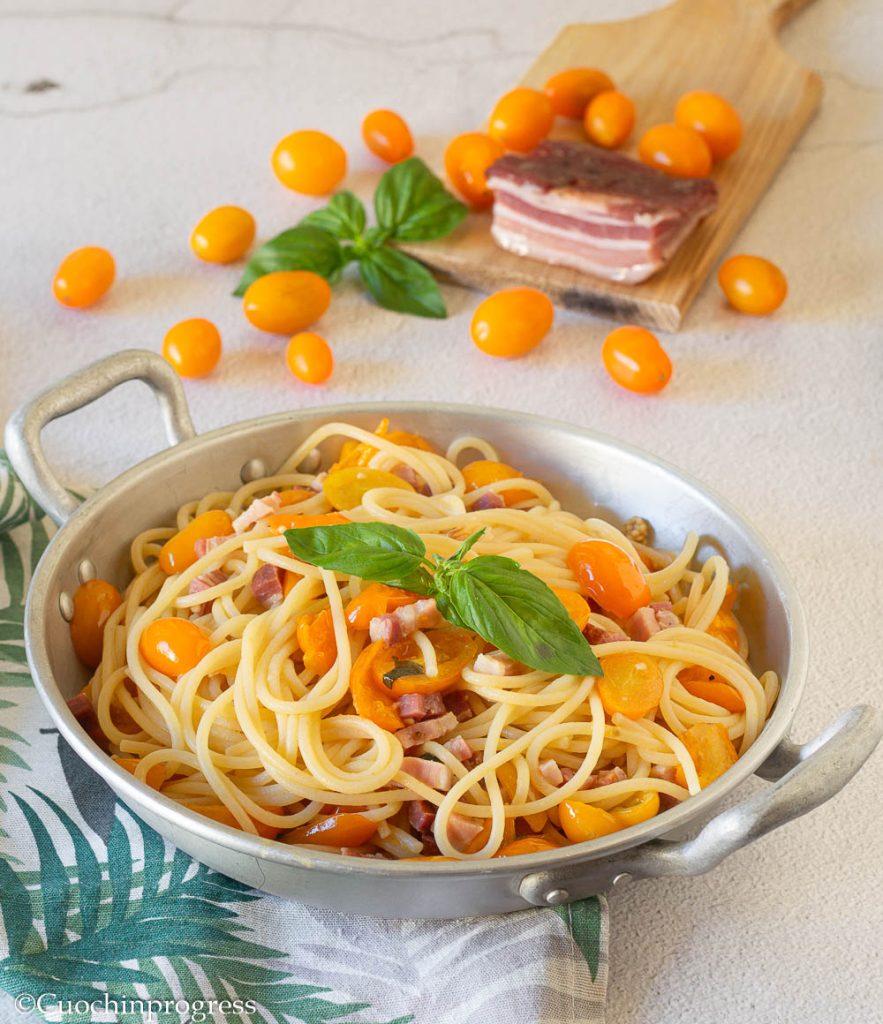 Les SPAGHETTIS AUX TOMATES CERISES JAUNES ET PANCETTA sont un premier plat qui marie la fraîcheur des tomates cerises jaunes à la saveur irrésistible de la pancetta croustillante.