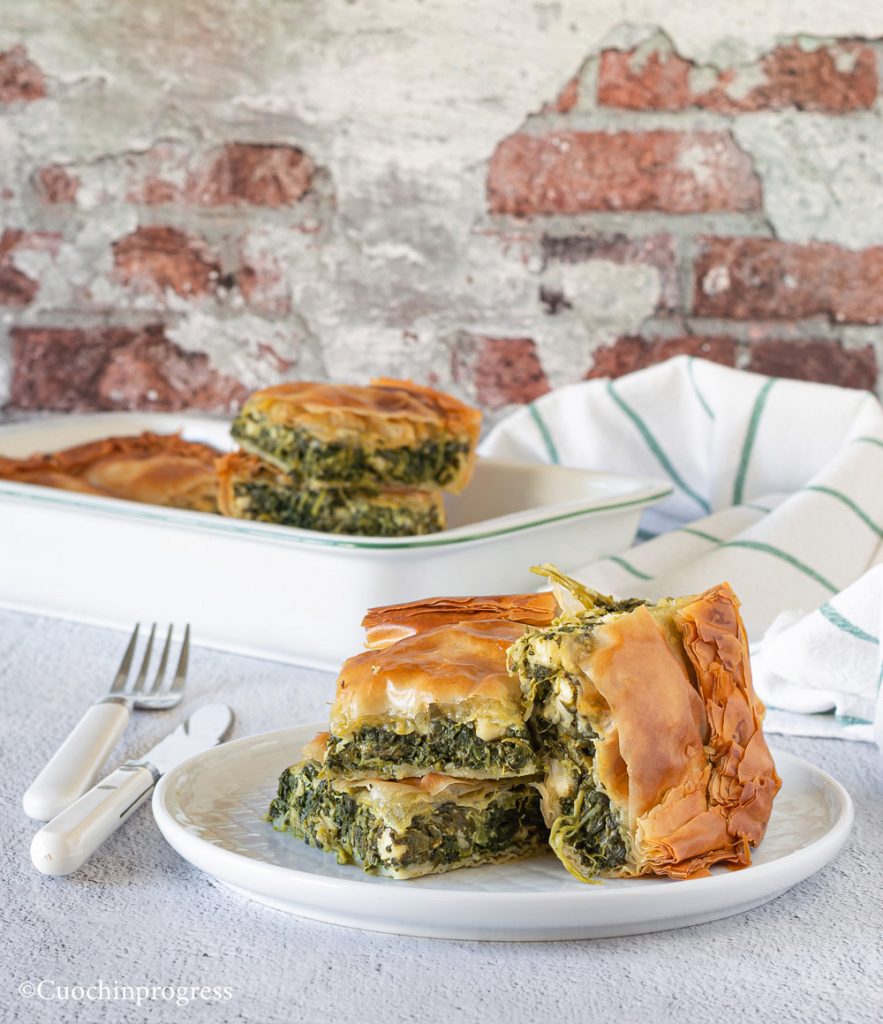 Cette tourte salée se caractérise principalement par son feuilletage, réalisé avec de la pâte filo et de l’huile d’olive (j’ai choisi cette version, mais si vous préférez, vous pouvez aussi utiliser du beurre), qui enveloppe une farce à base d’épinards, de féta, d’œufs et de ciboule, le tout parfumé d’un peu d’aneth et de poivre ; vous pouvez aussi ajouter de la muscade si vous le souhaitez. La douceur particulière des légumes se marie très bien avec la salinité prononcée du fromage, pour un plat vraiment savoureux et équilibré. Elle peut être consommée juste sortie du four ou, comme cela m’arrive souvent, tiède, après l’avoir préparée à l’avance.