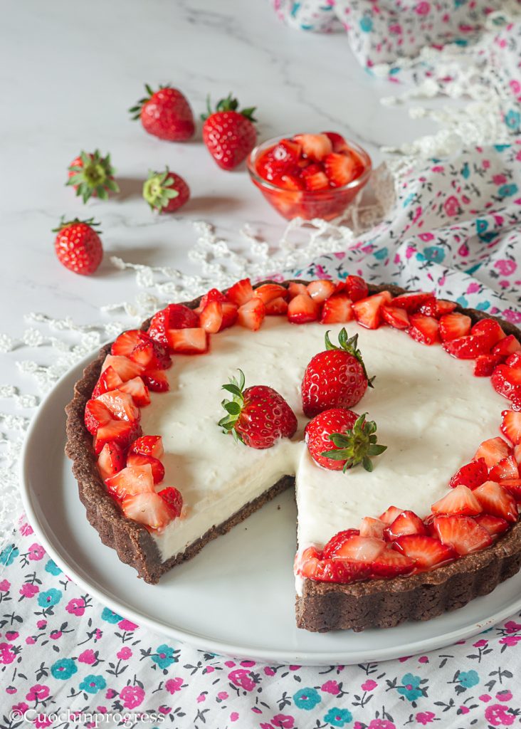 Cette tarte est une vraie merveille grâce à trois ingrédients simples parfaitement assortis : une pâte sablée au cacao croustillante, la crème au lait très onctueuse et enfin les fraises, dont la saveur délicate ressort dans cette composition. Différentes textures, arômes subtils et fraîcheur rendent ce dessert vraiment parfait. De plus, les couleurs (sombre la pâte, blanche la crème et rouges les fraises) apportent de la gaieté et rendent la tarte encore plus appétissante.