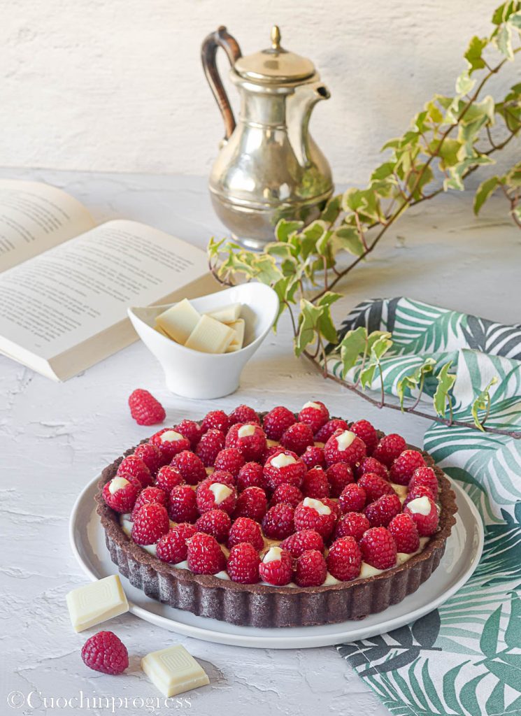 La réussite de ce dessert repose sur la combinaison parfaite des différents ingrédients, tous délicieux seuls, mais parfaits ensemble : la pâte sablée au cacao croustillante, la crème pâtissière au chocolat blanc onctueuse et enveloppante, et enfin les framboises, sucrées mais avec une légère acidité et un arôme intense, qui s’accordent à merveille avec le chocolat. Outre le palais, qui tient naturellement la première place, cette tarte séduit aussi les yeux, car elle est simple mais élégante, parfaite pour montrer, en plus de notre gourmandise, l’affection que nous portons à nos proches.
