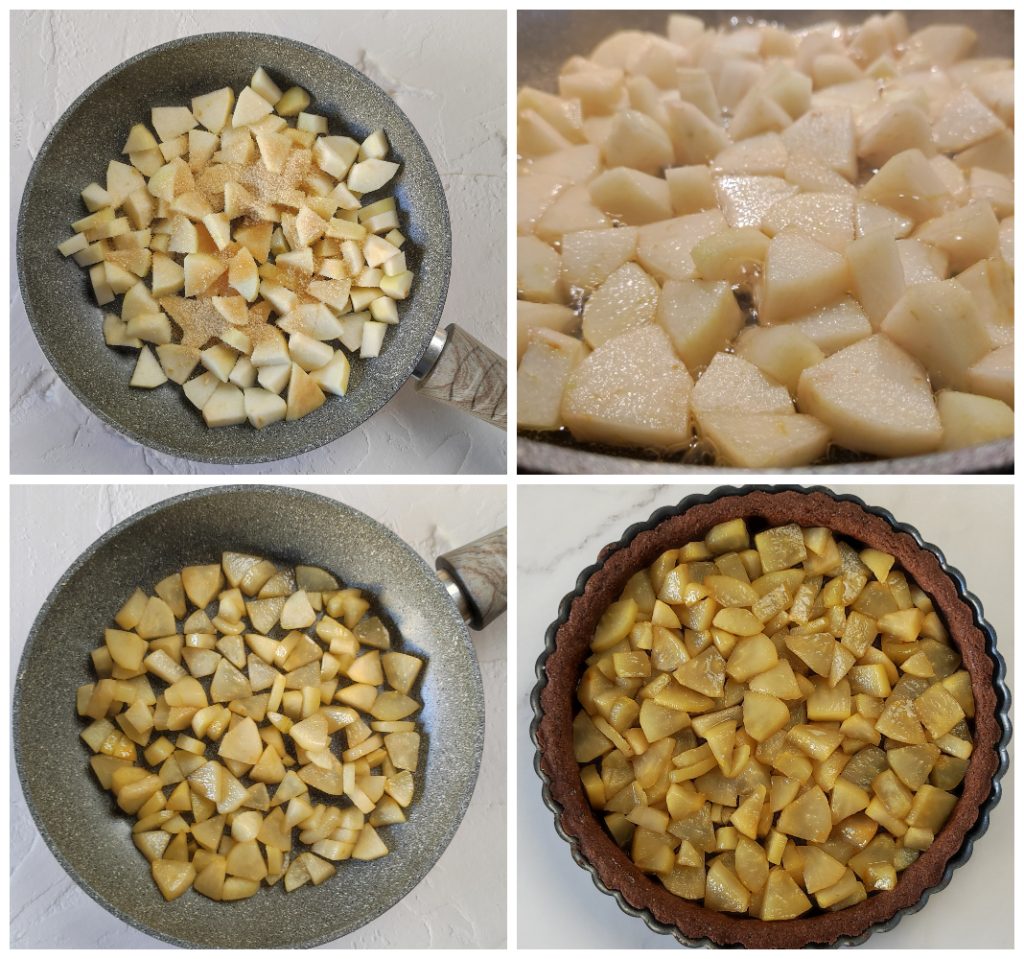 Pour décorer la tarte, coupez la poire en dés et faites-la revenir à la poêle avec le sucre, l’eau et la cannelle pendant 10 minutes ou jusqu’à ce qu’elle soit bien asséchée.