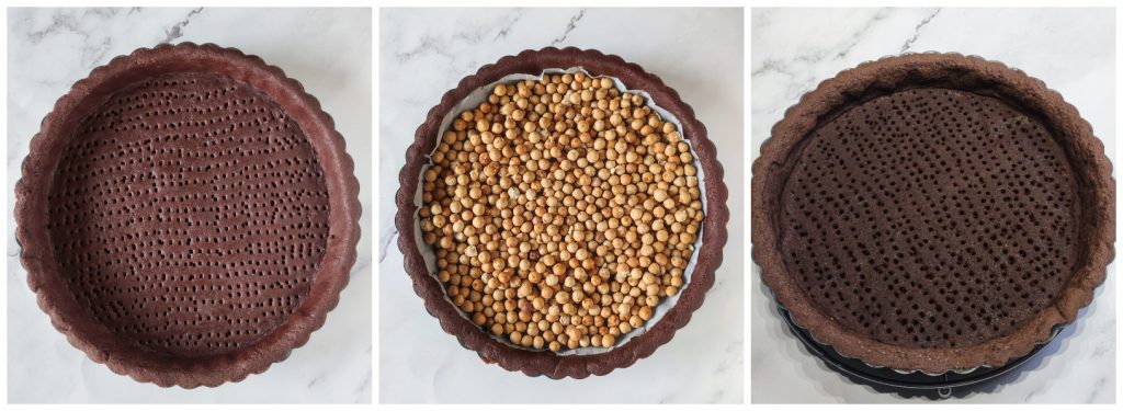 Couvrez-la de papier cuisson et remplissez-la de pois chiches secs pour la cuisson.