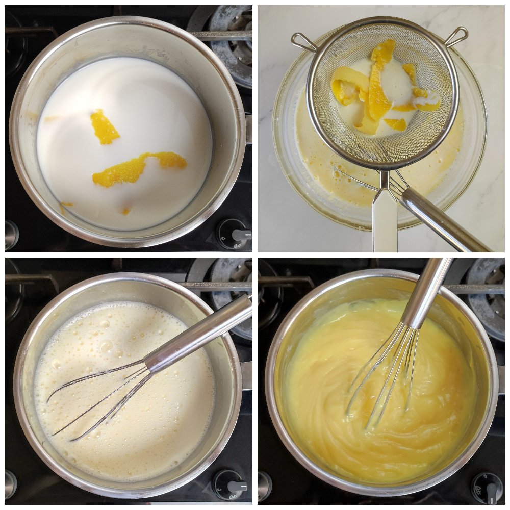 • Dans une casserole, mettez le lait avec le zeste de citron (en faisant attention à ne pas inclure la partie blanche qui rendrait le tout amer) et portez à frémissement.