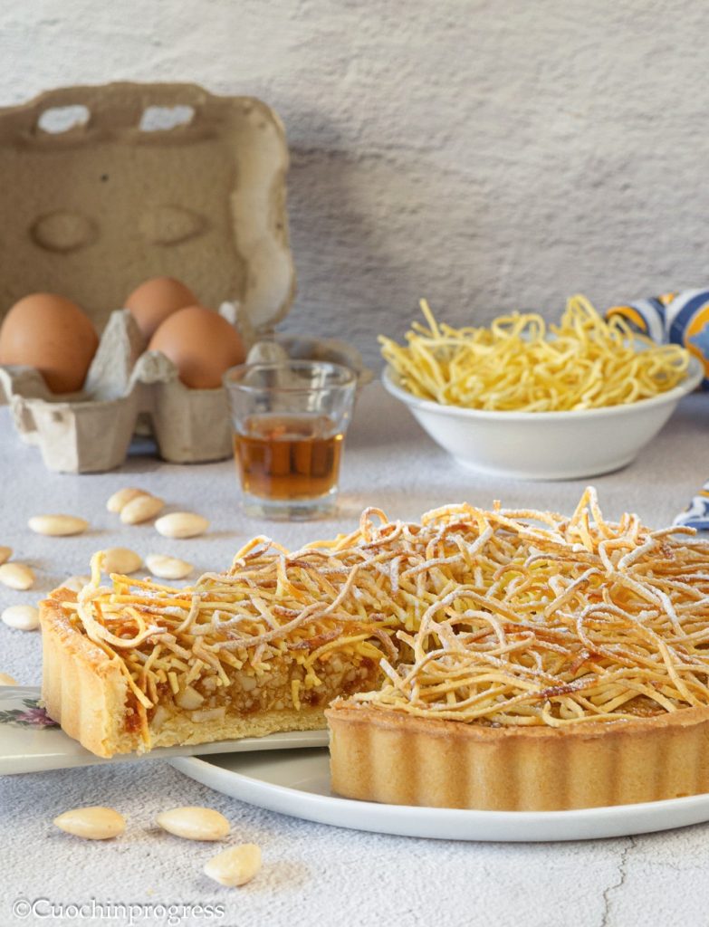 La TARTE DE TAGLIATELLES ou TARTE RICCIOLINA est un dessert de la tradition d’Emilie, particulièrement de Ferrare. Facile à préparer et très gourmande, elle se compose d’une base de pâte sablée qui renferme une garniture moelleuse aux amandes parfumée au liqueur d’amaretto (idéalement celui aux amandes amères), le tout recouvert d’un nid de tagliatelles ou, mieux, de tagliolini. Douceur, croquant, parfums : c’est une véritable symphonie pour le palais.