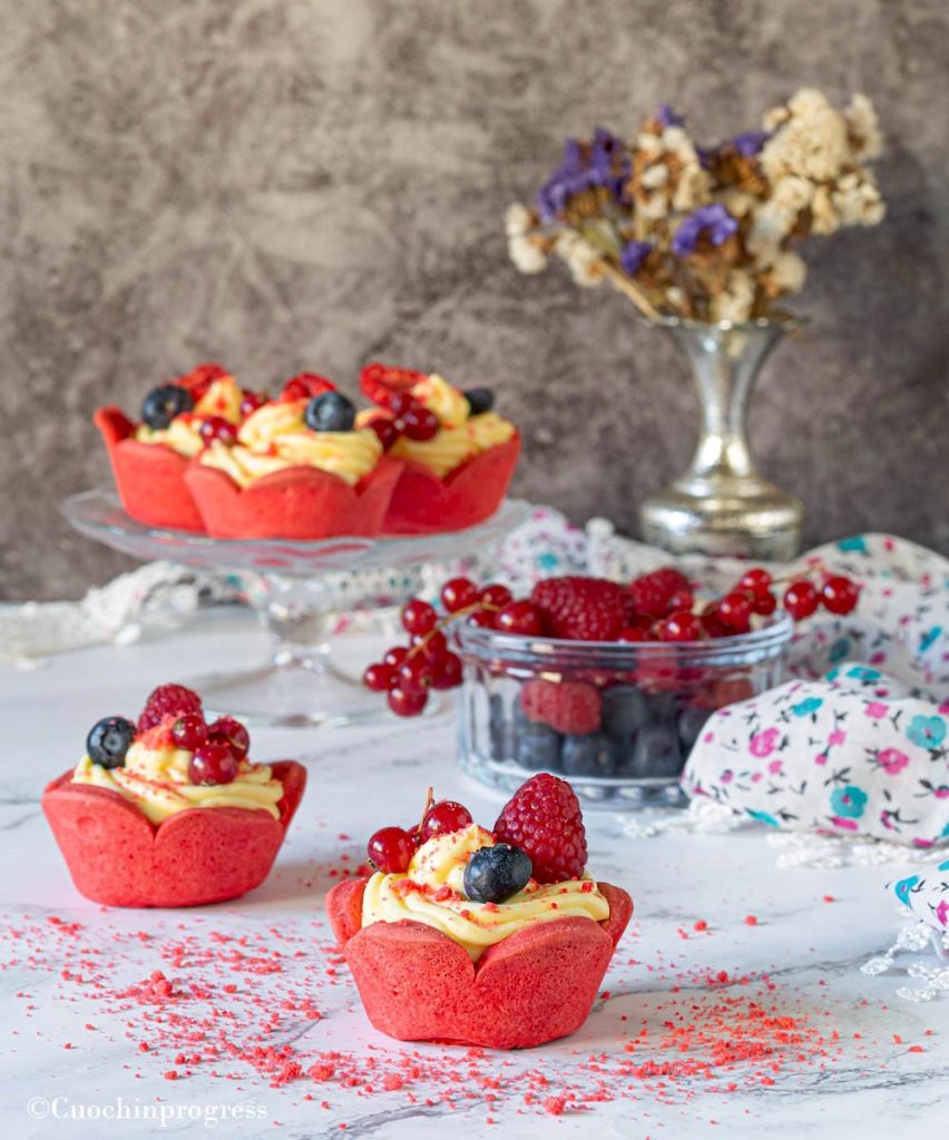 Ces tartelettes sont simples mais bien équilibrées : la base est une pâte sablée colorée, croquante et friable, tandis que la garniture est une délicieuse crème pâtissière, rendue plus onctueuse grâce à la crème fouettée. Pour la décoration, de petits fruits rouges apportent de la couleur, ainsi qu’une légère note acidulée et parfumée qui s’accorde à merveille avec la crème.