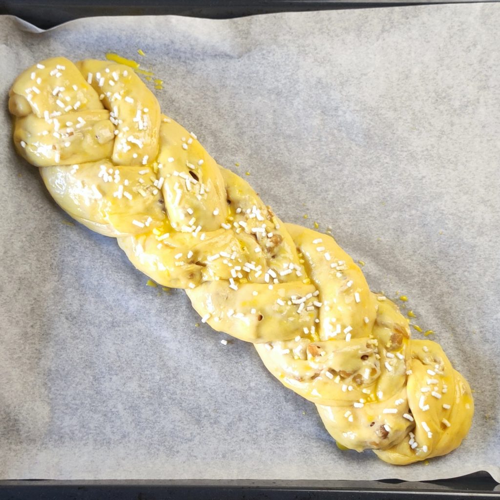 • Badigeonnez la tresse avec le jaune d’oeuf mélangé au lait et saupoudrez de sucre perlé.