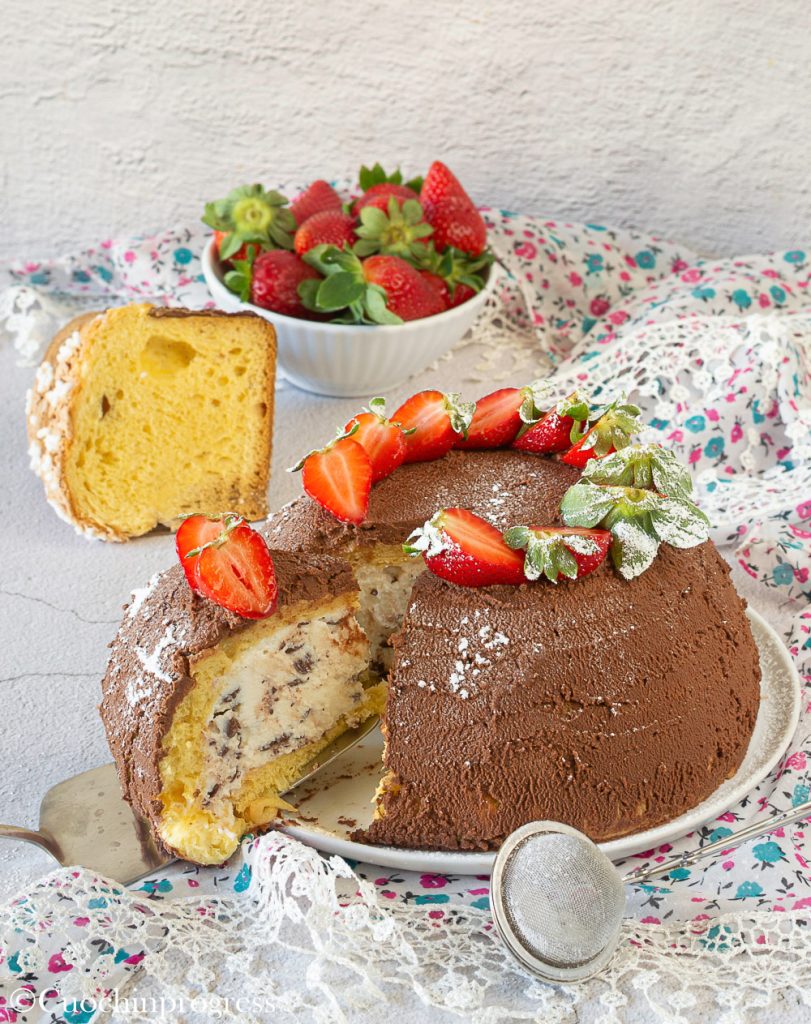 Le ZUCCOTTO DE PÂQUES est une façon créative et encore plus gourmande de présenter la colomba à vos amis et à votre famille pour le repas de Pâques. C’est un gâteau qui est plus simple à réaliser qu’à expliquer, donc ne vous laissez pas impressionner par la longueur des instructions. Je l’ai fait avec une garniture à la ricotta et aux fraises et recouvert d’une succulente ganache au chocolat noir. Vous pouvez vous amuser à le préparer avec les ingrédients qui vous plaisent le plus.