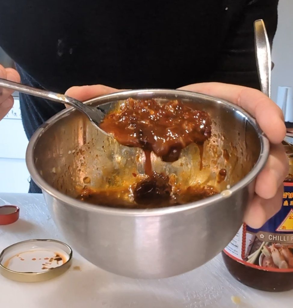 Pour préparer les aubergines au poivre de Sichuan : recette facile et authentique, j’ai commencé à préparer la sauce qui servira à assaisonner et à parfumer les aubergines. Pour la sauce, j’ai utilisé : 2 cuillères de sauce soja, 1 cuillère de sauce d’huîtres, 1 cuillère de vinaigre de riz, 1 cuillère à café de sucre, 1 cuillère à café de gingembre râpé, 1 cuillère d’huile de sésame, 1 cuillère à café de sauce pimentée (en alternative, un piment frais).