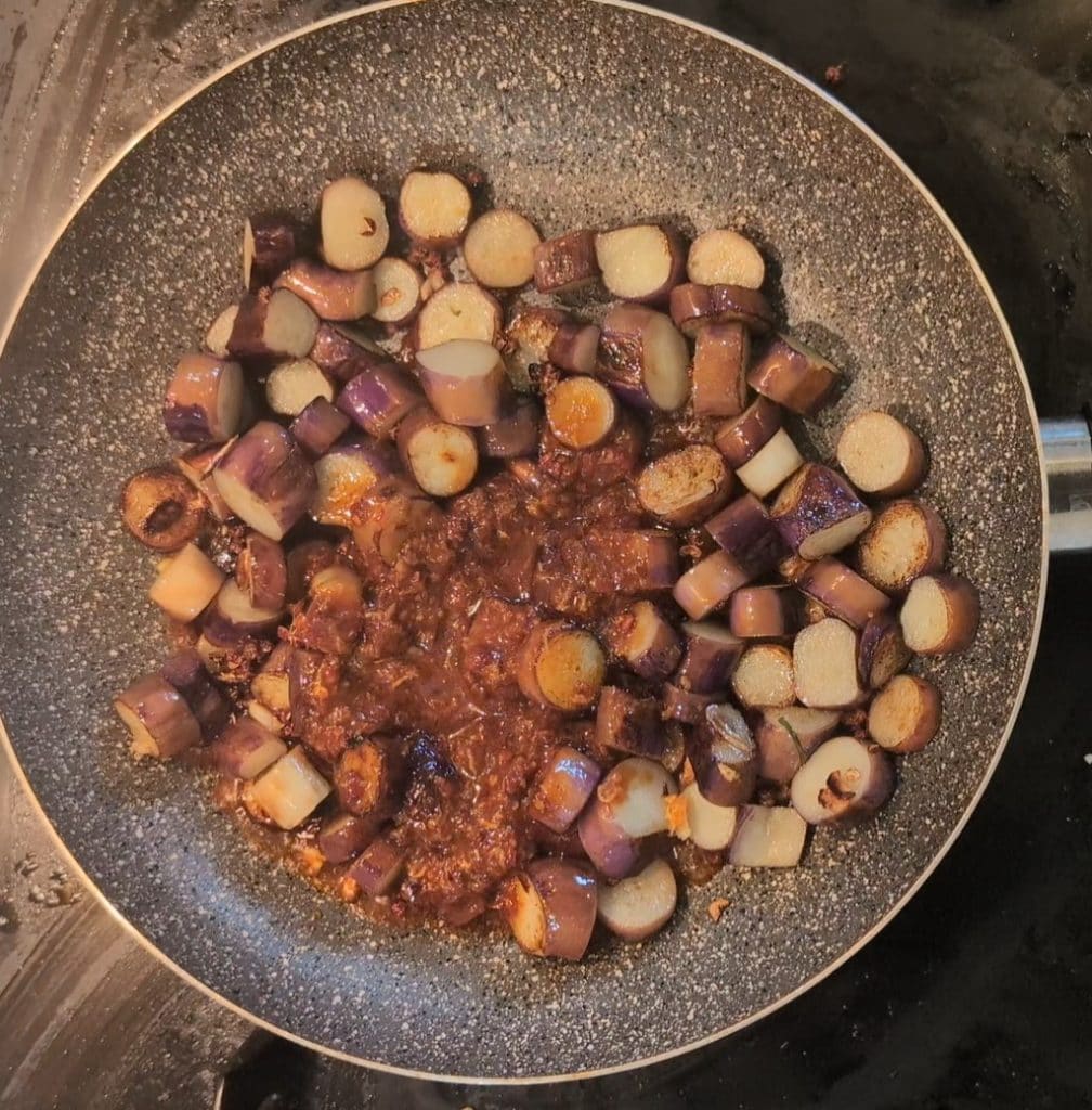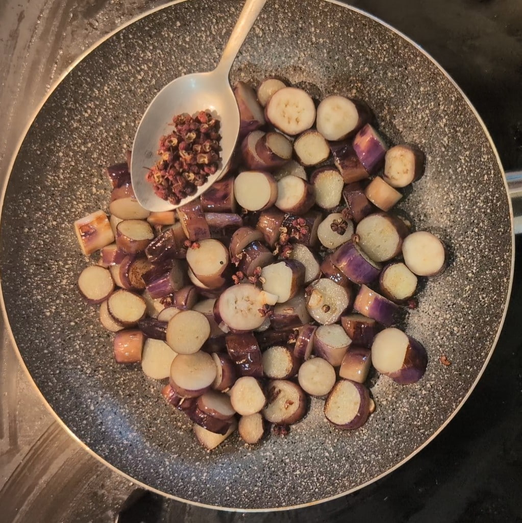 Ensuite, ajoutez les rondelles d’aubergines et faites-les revenir avec l’ail. Ajoutez également le poivre de Sichuan : ainsi, pendant la cuisson des aubergines, son arôme se libérera et se mélangera parfaitement avec le goût des aubergines.