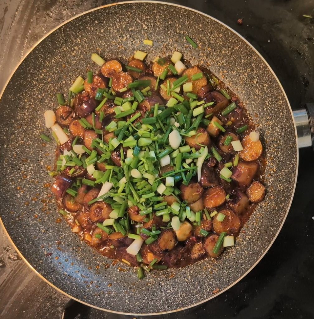 Pour conclure, éteignez le feu et couvrez la poêle avec un couvercle. Laissez reposer pendant 5 minutes afin de rehausser tous les arômes des ingrédients. Après le repos, les aubergines seront encore plus savoureuses et parfumées, avec le goût des épices et de la sauce soja bien absorbé. L’oignon blanc ajoutera une note fraîche et croquante. Servez chaud avec du riz blanc ou des nouilles de riz. Les aubergines seront tendres et crémeuses.