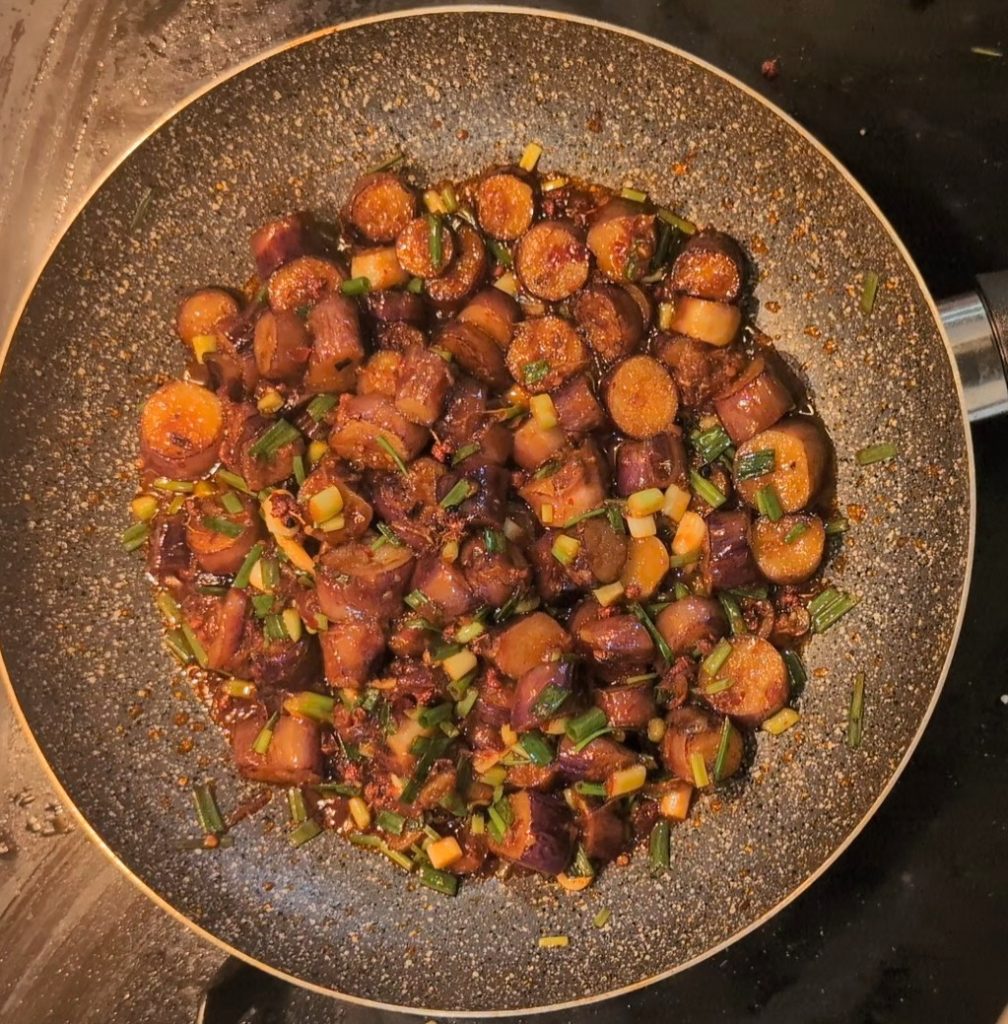 Aubergines au Sichuan : un voyage de saveurs épicées. Les aubergines au Sichuan sont un plat qui a conquis mon cœur dès la première bouchée. Je me souviens encore de la sensation de surprise et de joie face à cette explosion de goût épicé et aromatique. Depuis lors, j’ai toujours voulu recréer cette saveur magique dans ma cuisine. Avec cette recette facile et authentique, vous pourrez enfin préparer les aubergines au Sichuan directement chez vous. Il vous suffira de quelques ingrédients courants et d’une pincée de patience pour apporter à table un plat qui vous fera voyager avec le goût en Chine. Les aubergines, tendres et savoureuses, se fondent dans un câlin épicé avec la sauce aromatique, créant une explosion de goût irrésistible. Un plat parfait pour les amateurs de saveurs orientales, qui plaira même à ceux qui n’aiment pas les plats trop épicés (vous pouvez en effet ajuster la quantité de piments selon votre goût). Qu’attendez-vous ? Mettez à l’épreuve vos compétences culinaires et préparez les aubergines au Sichuan. Servez-les avec du riz blanc ou un plat de nouilles pour une expérience culinaire complète. Préparez-vous à une explosion de saveurs avec cette recette authentique de la tradition culinaire du Sichuan ! Qu’attendez-vous ? Essayez-la maintenant !