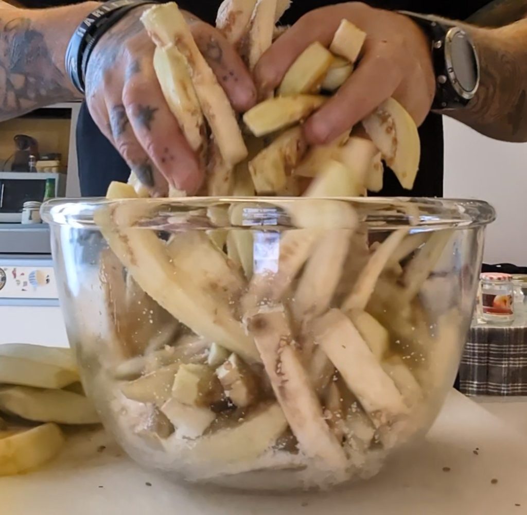 • Après avoir terminé cette étape, mélangeons-les soigneusement, afin de nous assurer que chaque aubergine soit bien salée, pour enlever le plus d’eau possible
