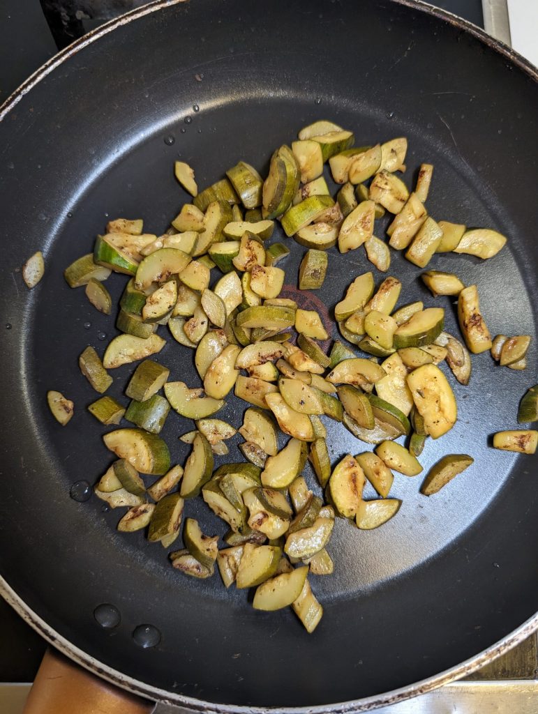 Faites revenir les courgettes dans une poêle antiadhésive avec un demi-verre de vin blanc ou d’eau, une cuillère à café de vinaigre et une pincée de sel. Faites cuire à feu moyen-élevé jusqu’à ce que les courgettes soient tendres et que les liquides soient complètement absorbés. (Mettez de côté et nettoyez la poêle)
