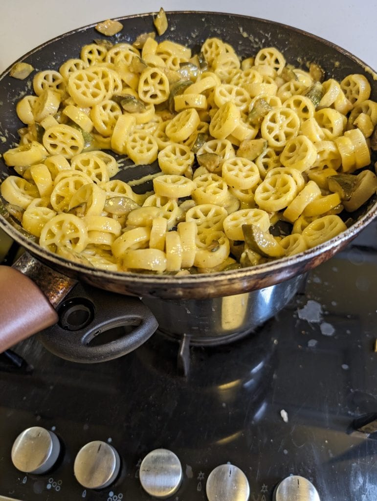 Mélangez les pâtes, les courgettes et la crème hors du feu, ou sur la casserole d’eau des pâtes tenue à feu éteint pendant 3-5 minutes après avoir égoutté les pâtes avec une louche. Si vous n’avez pas utilisé d’œufs très frais, cette opération pasteurise les œufs.