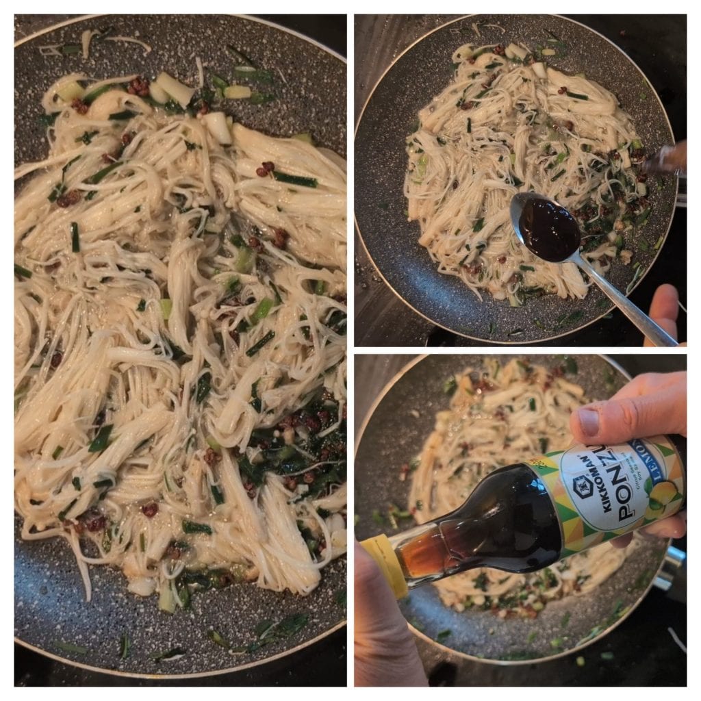 • Dès que les champignons enoki sont attendris, j’ai ajouté une cuillère à café de sauce d’huître et 2 cuillères de sauce ponzu pour équilibrer la saveur. Le résultat est un plat savoureux avec une légère touche d’acidité. La saveur salée de la sauce d’huître est bien équilibrée par la légère acidité de la sauce ponzu.