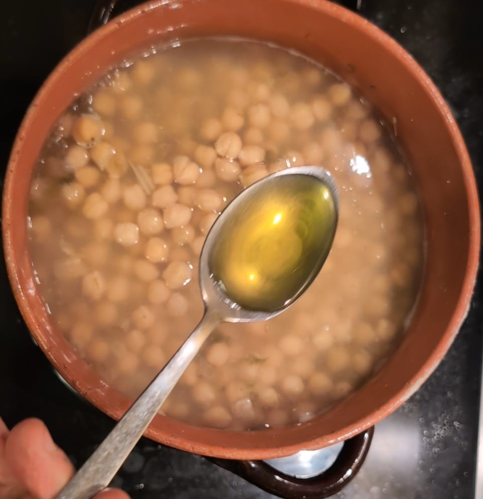 Pour finir et après avoir laissé reposer les pois chiches, mettez une ou deux cuillères à soupe d’huile d’olive extra vierge à cru, encore mieux lorsque les pois chiches seront complètement refroidis à température ambiante.