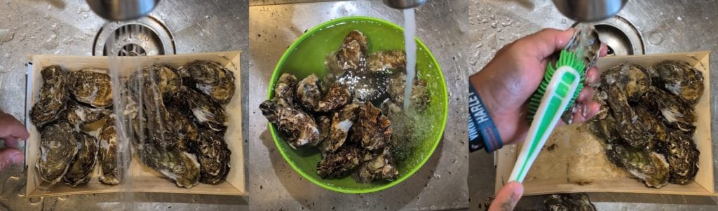 Après avoir ouvert l’emballage, avant de procéder à l’ouverture des huîtres, il est important de les laver soigneusement. Passe-les sous l’eau courante froide et, à l’aide d’une brosse de cuisine, frotte délicatement chaque huître pour éliminer les éventuels résidus de terre ou autres impuretés qui, s’ils finissaient à l’intérieur, pourraient compromettre leur saveur.
