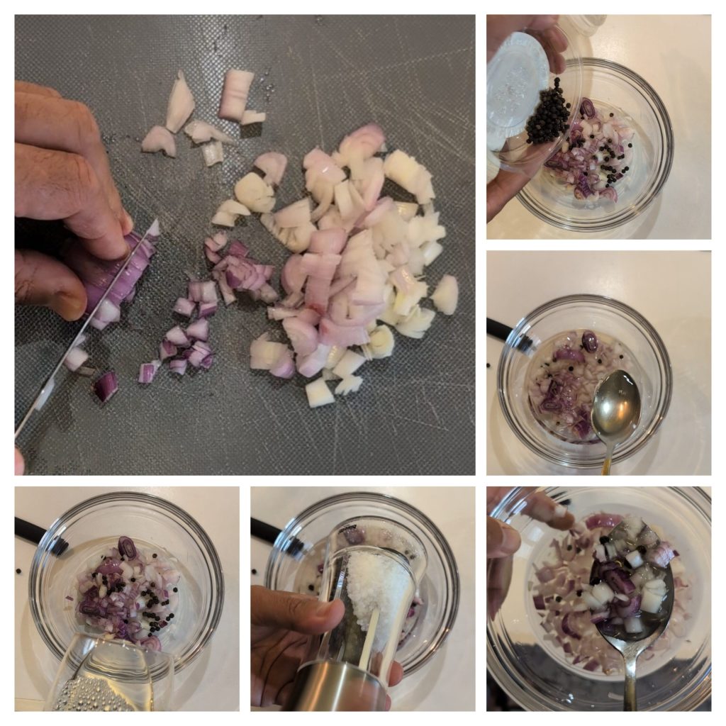 Les huîtres sont toutes ouvertes et nettoyées, prêtes à être servies! Comme je te l’avais promis dans l’introduction, voici une délicieuse petite sauce pour les accompagner et en profiter au mieux : la classique « mignonette« . C’est la sauce que tu trouveras dans n’importe quel bistrot ou restaurant français servant des huîtres crues ou des fruits de mer crus en général comme plateau. La préparer est très simple. Il te suffit de hacher finement une échalote et de l’assaisonner dans un bol avec du vinaigre de vin blanc, du vin blanc sec, des grains de poivre noir fraîchement moulus et une pincée de sel. Laisse mariner le tout pendant une demi-heure environ.