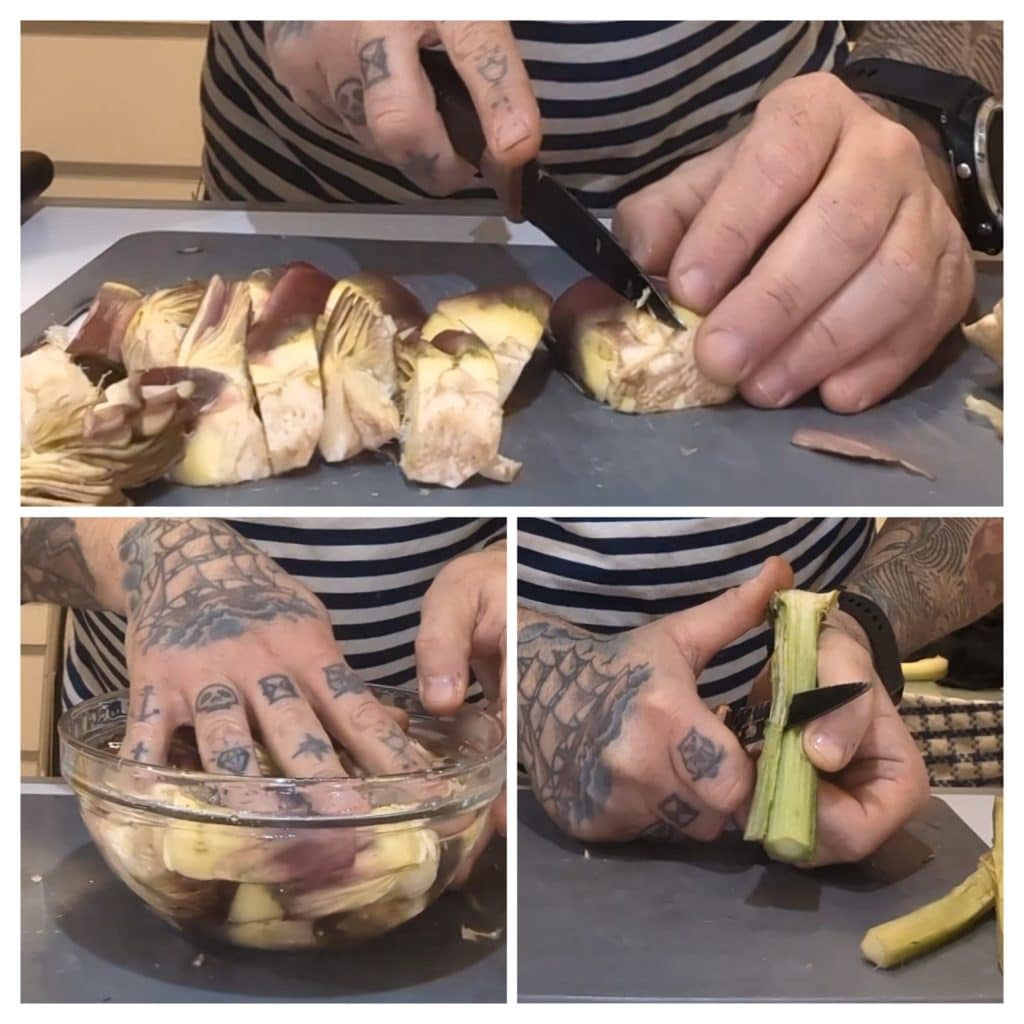 Pour préparer le lapin avec les artichauts, j’ai commencé par nettoyer les artichauts. J’ai enlevé les feuilles extérieures les plus dures, la partie intérieure filandreuse et la partie extérieure de la tige, que nous utiliserons également. Après les avoir coupés en quartiers, je les ai laissés tremper dans de l’eau et du citron pour éviter qu’ils ne noircissent.