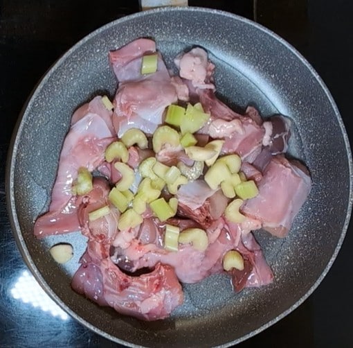 Après avoir nettoyé les artichauts, je les laisse tremper dans de l’eau et du citron pour éviter qu’ils ne noircissent. À ce stade, pour une cuisson légère et digeste, je fais rissoler le lapin avec le céleri et un peu d’eau et de vinaigre, sans ajouter aucun assaisonnement, afin de préserver sa saveur naturelle.