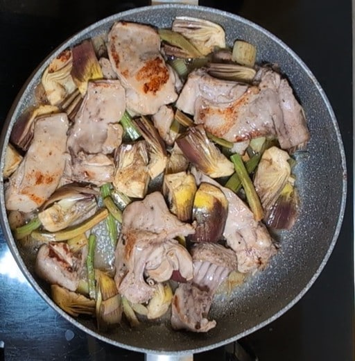 Une fois que le lapin est bien doré de chaque côté, j’ajoute les artichauts, y compris les tiges, et un verre de vin blanc. Je laisse évaporer la partie alcoolique avant d’ajouter d’autres ingrédients.