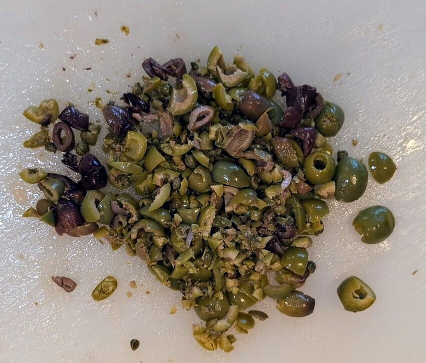 Pendant que le saumon repose, consacrons-nous à la préparation d’un savoureux hachis d’olives et câpres. Munissez-vous d’un couteau bien aiguisé et hachez grossièrement une bonne quantité d’olives taggiasche, olives noires et olives vertes dénoyautées. Ne vous inquiétez pas si certains morceaux restent plus gros, car nous en laisserons quelques-uns entiers pour ajouter une touche de texture au plat. Ajoutez les câpres au hachis, selon votre goût.