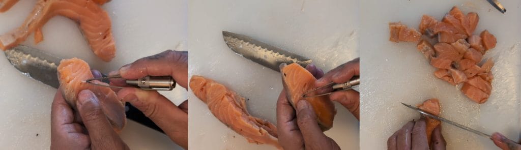 Pour commencer, il faut nettoyer soigneusement la tranche de saumon frais. Tout d’abord, retirez la peau avec un couteau bien aiguisé, en l’incisant près de la chair et en la tirant délicatement vers le haut. Puis, enlevez la partie la plus grasse du saumon, généralement sombre et compacte, toujours en utilisant le couteau. Enfin, passez vos doigts sur la chair pour repérer les arêtes et extrayez-les avec précaution une par une avec une pince.