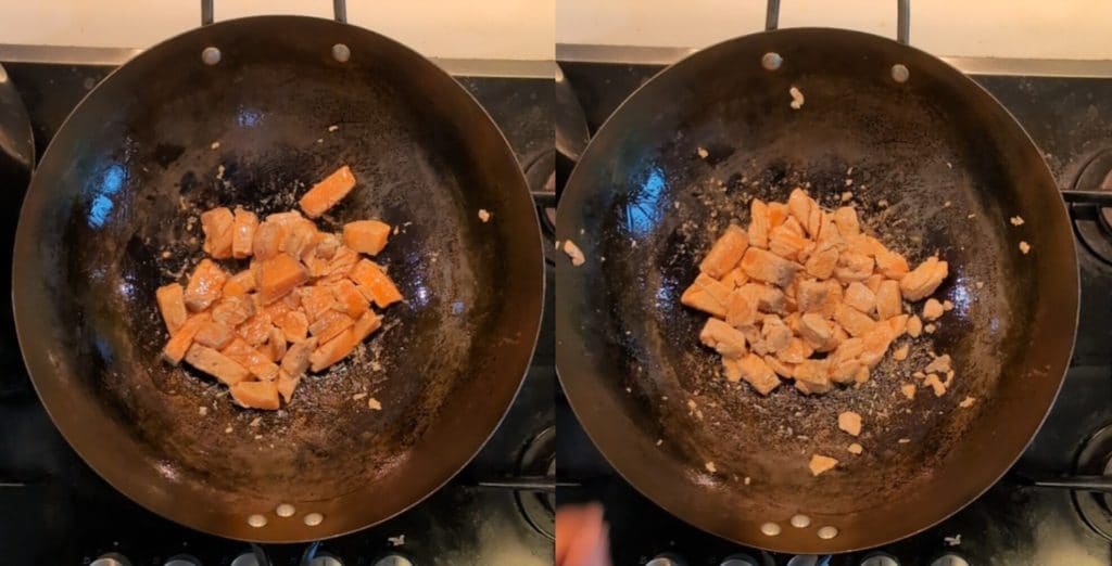 Une fois que les pâtes sont bien liées, éteignez le feu. Ajoutez le saumon saisi que vous avez mis de côté, en l’émiettant délicatement avec une fourchette pour le répartir uniformément sur les pâtes. Mélangez soigneusement pour incorporer le saumon au condiment.