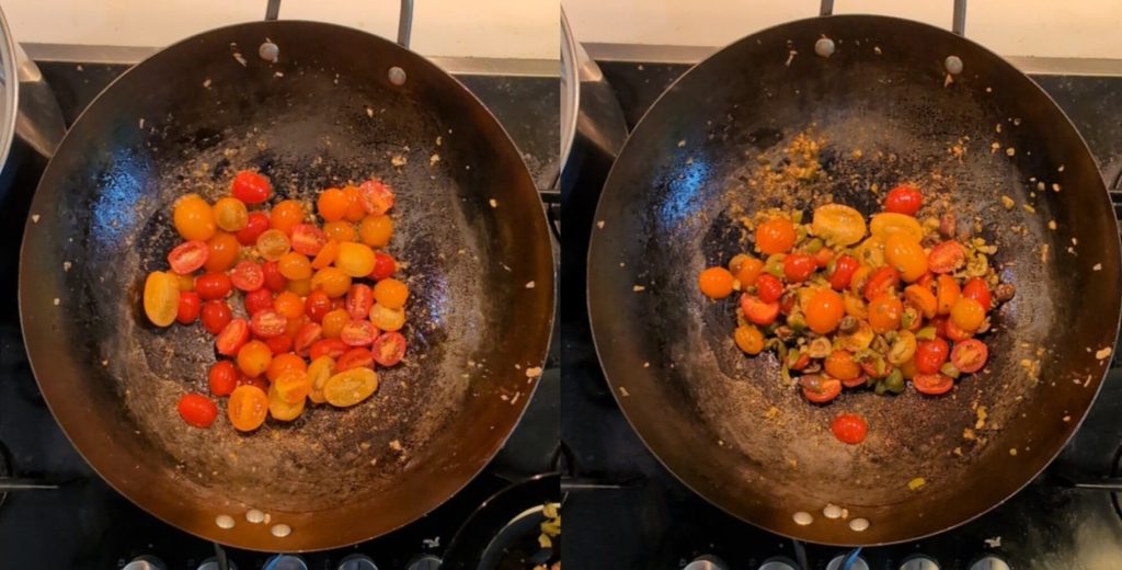 Une fois le saumon saisi, mettez-le de côté pour le moment. Dans la même poêle, sans avoir besoin de la nettoyer si elle n’est pas excessivement sale, ajoutez un autre filet d’huile d’olive extra vierge et faites revenir les tomates cerises pendant environ 10 minutes à feu moyen. Les tomates cerises doivent légèrement se flétrir et commencer à rôtir.