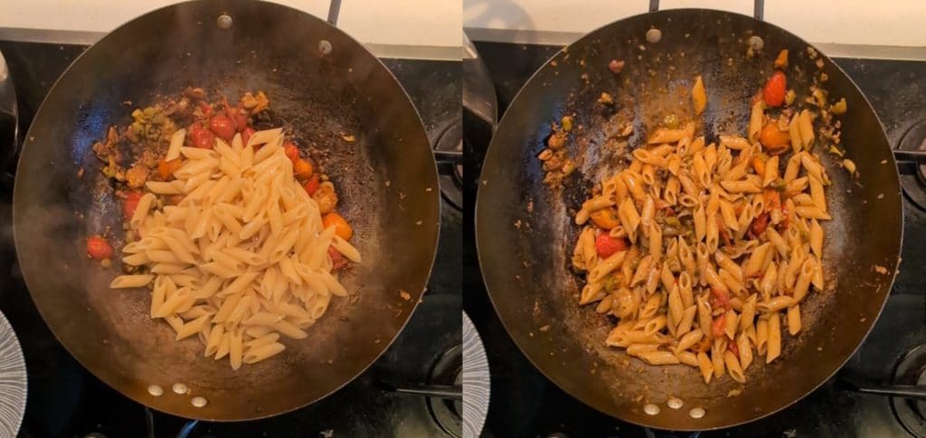 Pendant que la sauce de tomates cerises, olives et câpres repose, cuisez les pâtes dans une grande quantité d’eau bouillante salée. Égouttez-les al dente, en conservant une louche d’eau de cuisson, et versez-les directement dans la poêle avec le condiment. Ajoutez l’eau de cuisson mise de côté et mélangez soigneusement pour bien lier le tout.