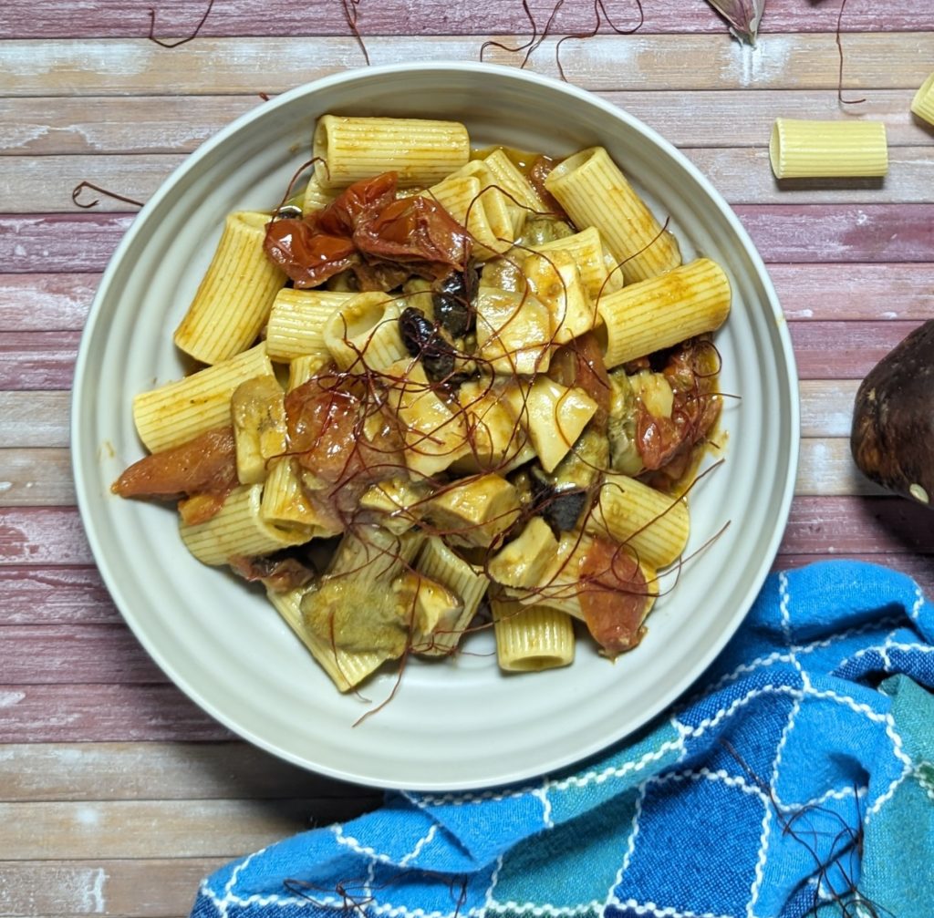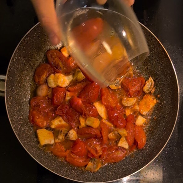 • Maintenant, nous pouvons ajouter également la tête du champignon que nous avons coupée et mise de côté au début. Continuez la cuisson pendant encore 10 minutes, en ajoutant de l’eau de cuisson des pâtes si nécessaire.