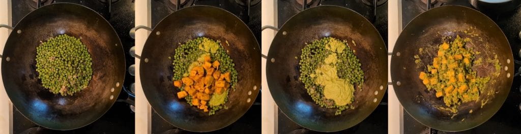 Dès que l’oignon a commencé à dorer, j’ai ajouté les petits pois surgelés et une pincée de sel. J’ai laissé cuire les petits pois à feu moyen, sans ajouter d’autres épices pour préserver leur goût naturel. Les épices que je souhaitais, je les avais déjà utilisées pour mariner le tofu. J’ai ajouté seulement un demi-verre d’eau et j’ai poursuivi la cuisson pendant environ 20 minutes, le temps nécessaire pour que les petits pois cuisent et que l’eau soit absorbée.