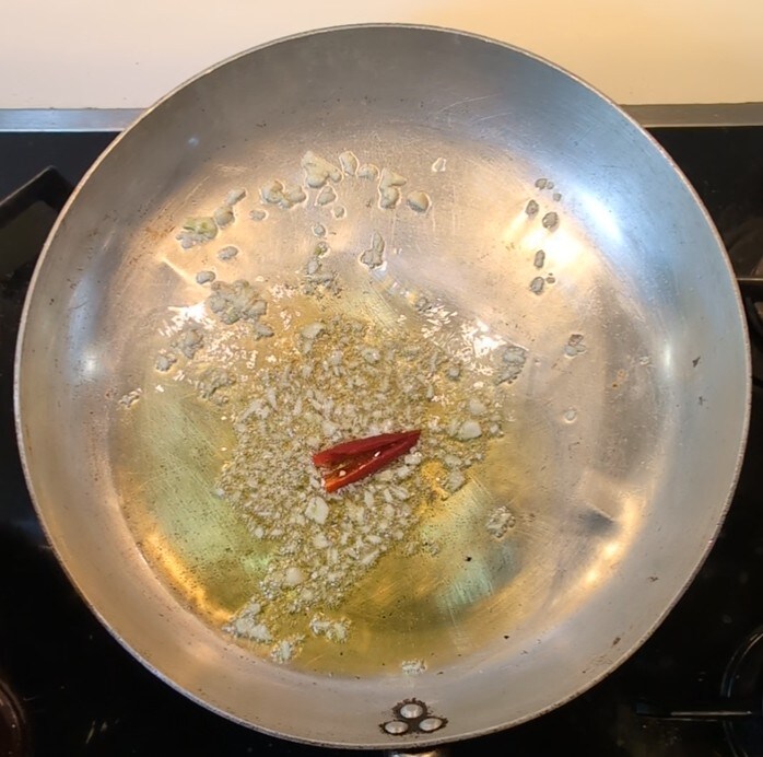 • Tandis que les champignons blanchissent dans l’eau bouillante, dans une poêle à part, chauffons un filet d’huile d’olive extra vierge. Ajoutons une gousse d’ail finement hachée et faisons-la revenir à feu moyen-doux jusqu’à ce qu’elle soit dorée. À votre guise, vous pouvez ajouter un piment fort haché pour un accompagnement plus savoureux.