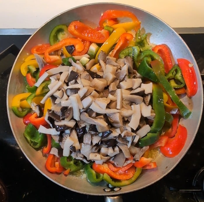• À ce stade, les champignons sont prêts à être ajoutés aux poivrons et après les avoir égouttés et bien laissés égoutter, ajoutons les pleurotus blanchis aux poivrons dans la poêle. Pour éviter les éclaboussures d’huile, je te recommande de tamponner les champignons avec un papier absorbant pour les sécher complètement.