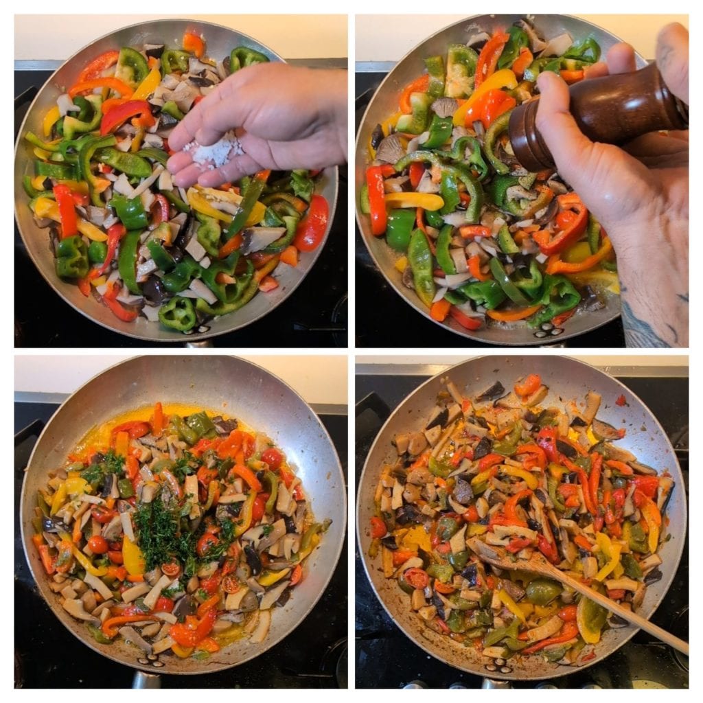 • À ce stade, il ne nous reste plus qu’à assaisonner et cuire notre plat : Réglons le sel et le poivre moulu à votre goût. Et si vous le souhaitez, ajoutez également du persil finement haché. Cuisez pendant environ 15 minutes à feu moyen, en remuant de temps en temps, jusqu’à ce que les champignons et les poivrons soient tendres mais encore croquants.