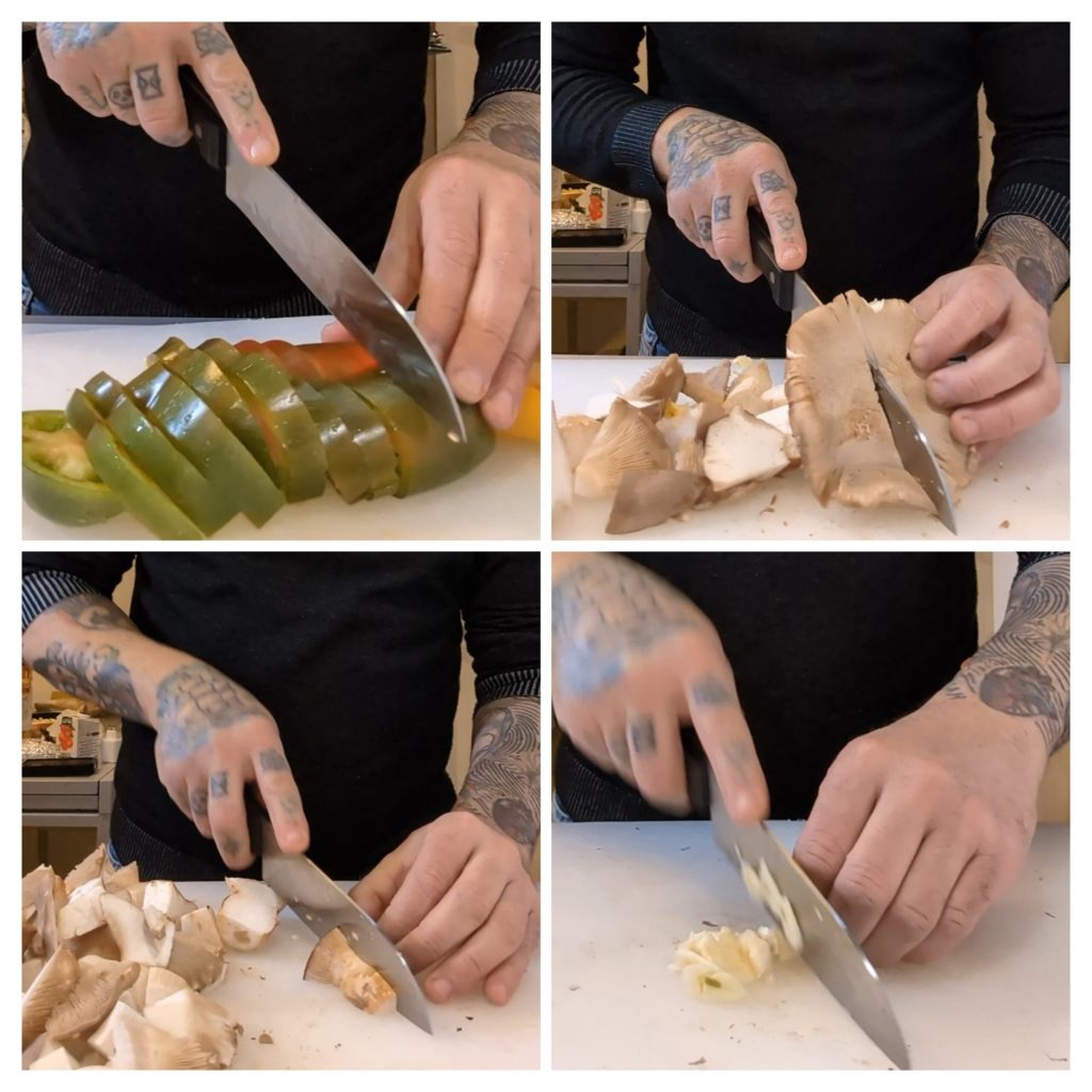 • Pour préparer les poivrons et champignons à la poêle, j’ai nettoyé et coupé en lamelles les poivrons. Ensuite, j’ai nettoyé les champignons et les ai coupés en lamelles. Enfin, j’ai haché finement une gousse d’ail.