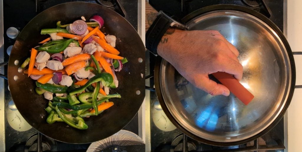 Une fois que le poulet est doré et cuit à l’extérieur, ajoutons les légumes : carottes, poivrons et oignon.