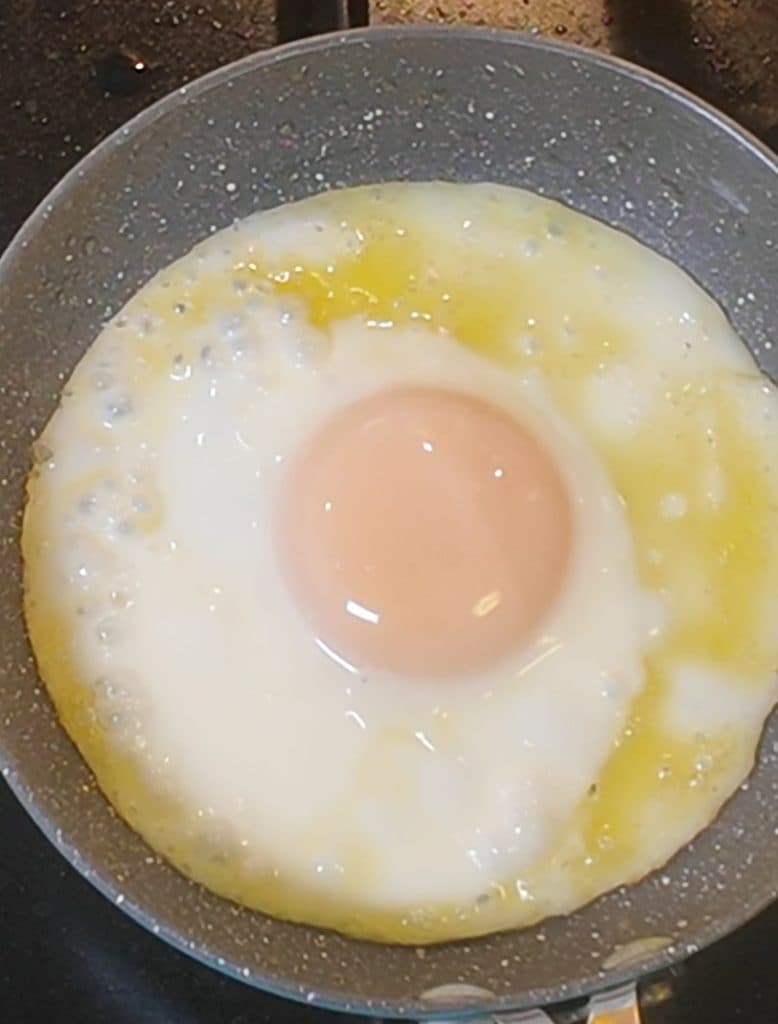Dans une autre petite poêle, faites cuire les œufs au plat avec un filet d’huile d’olive extra vierge, un par convive.