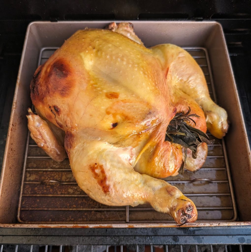 • Pour la cuisson, nous pouvons choisir parmi plusieurs options: Four statique préchauffé à 180°C et cuire le poulet pendant environ 2 heures si le poids dépasse 2 kg. Et fonction grill pendant 30 minutes pour une peau particulièrement croustillante et savoureuse. Si vous préférez utiliser le barbecue, allumez le feu et réglez le thermostat à 180°C et cuire le poulet avec le couvercle fermé pendant environ 2 heures et 30 minutes. Dans mon cas, j’ai opté pour la cuisson sur un barbecue à gaz avec le couvercle fermé et le thermostat réglé à 180°C pendant 2 heures et 30 minutes.