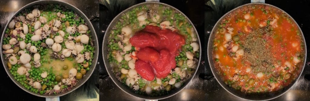 Après 10 minutes de cuisson des seiches, c’est le moment d’ajouter les petits pois. Je les ai versés dans la poêle, et juste après j’ai ajouté les tomates pelées. Je les ai grossièrement écrasées avec une cuillère en bois pour obtenir une sauce plus rustique. Si vous préférez une sauce plus fine, vous pouvez écraser les tomates avec les mains avant de les ajouter.