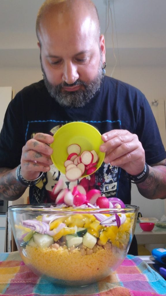 Ajoute dans le bol avec le couscous tous les ingrédients coupés : les légumes frais, les pois chiches bien égouttés et lavés.